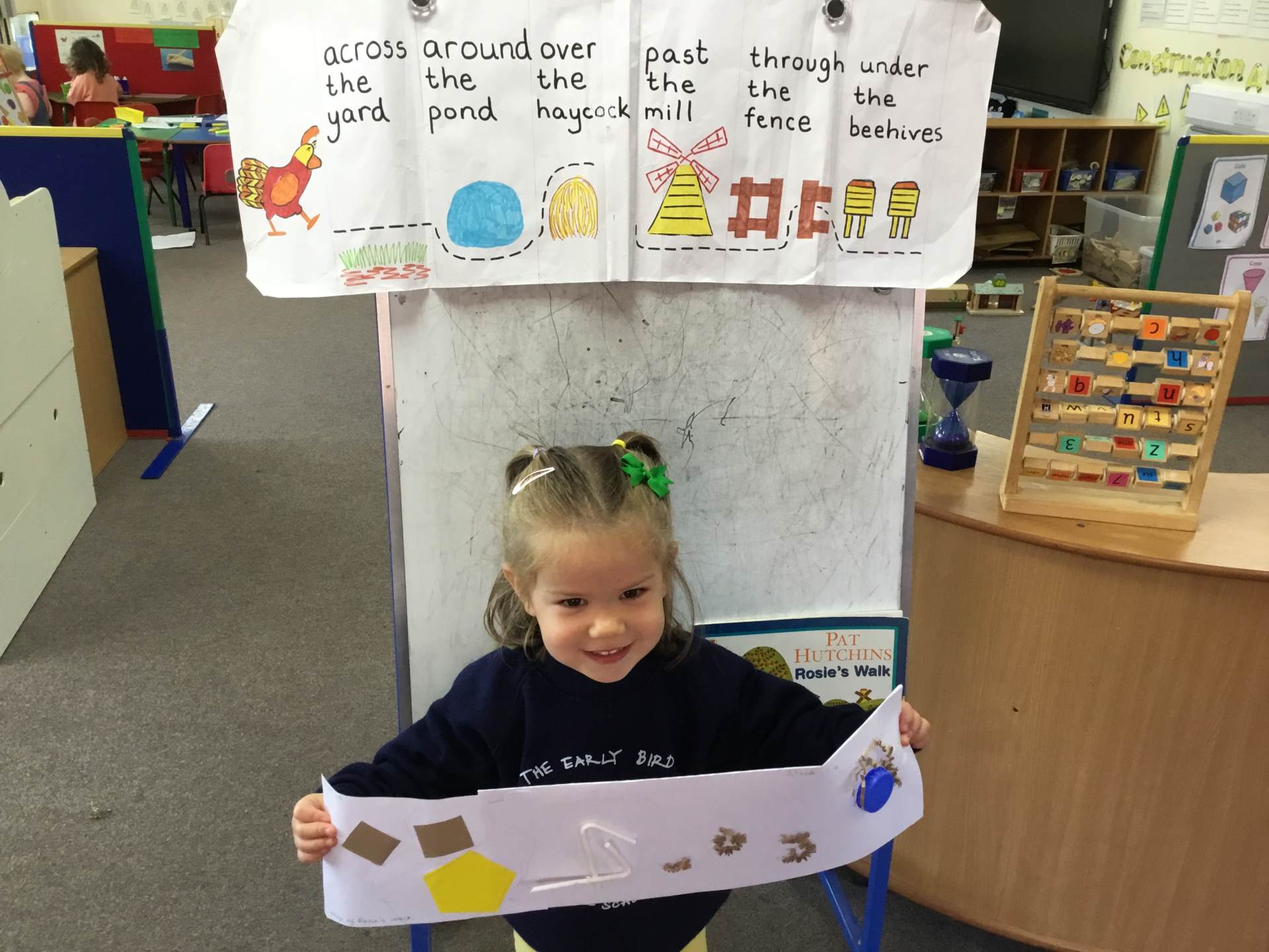 The children have enjoyed their Talk for Writing text – Rosie’s Walk. They have been learning about routes and positional language and have recreated the story in PE with Mr Drake. One lesson involved going over, under, through and around the apparatus. They enjoyed making the windmill from the story, by following a set of instructions, using a cup, tissue paper and lolly sticks. They also made their own story map to retell the story.