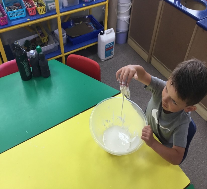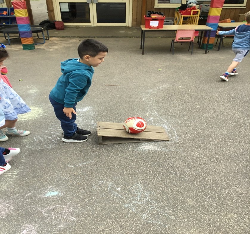 Exploring forces involved pushing pulling and rolling balls of different sizes along different surfaces and twisting, pressing, rolling, pushing play dough and making oobleck – a mix of cornflour and water.