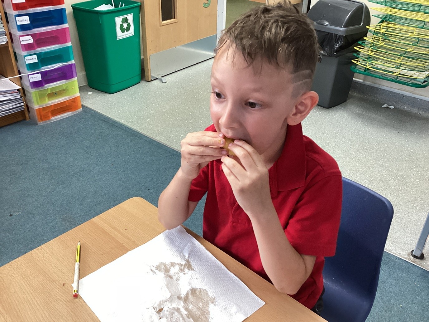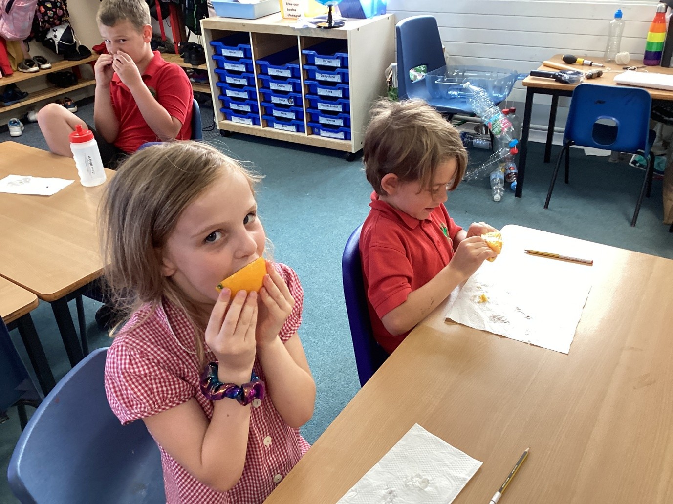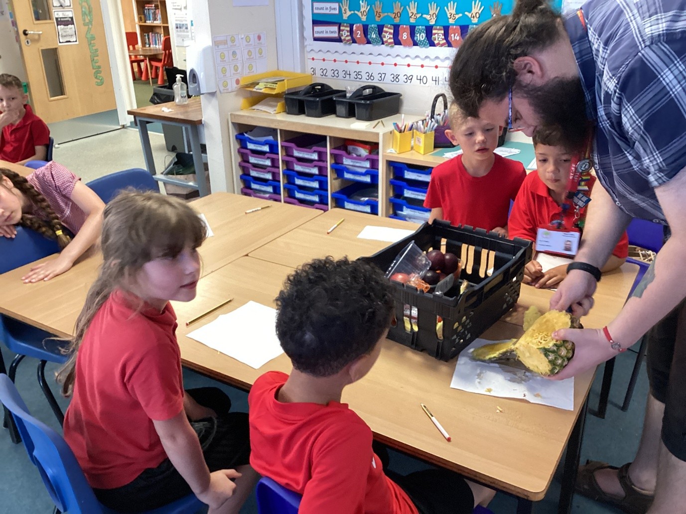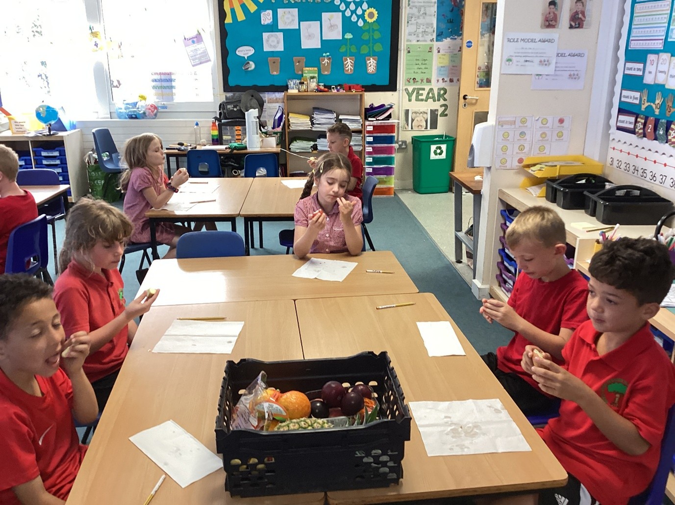 The children had to recognise that food comes from plants and animals and describe what happens on a farm. They identified and described what happens on a dairy farm and suggested reasons why the weather in Devon makes it a good place for dairy farming. They also described how cheese is made from milk. They learned about UK top 10 favourite fruits, tasted and ranked them for themselves.