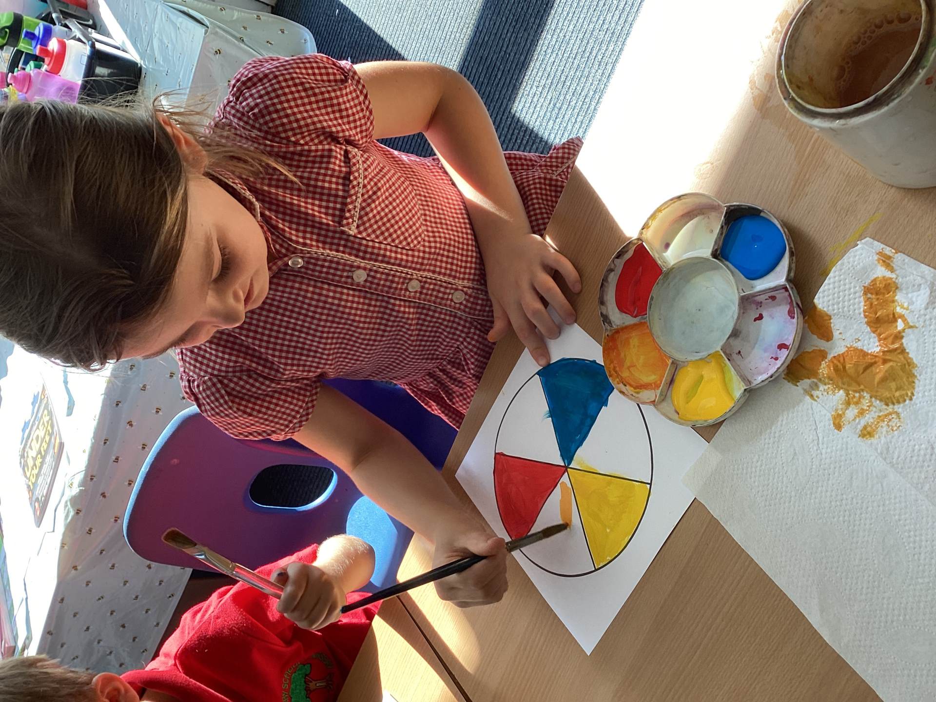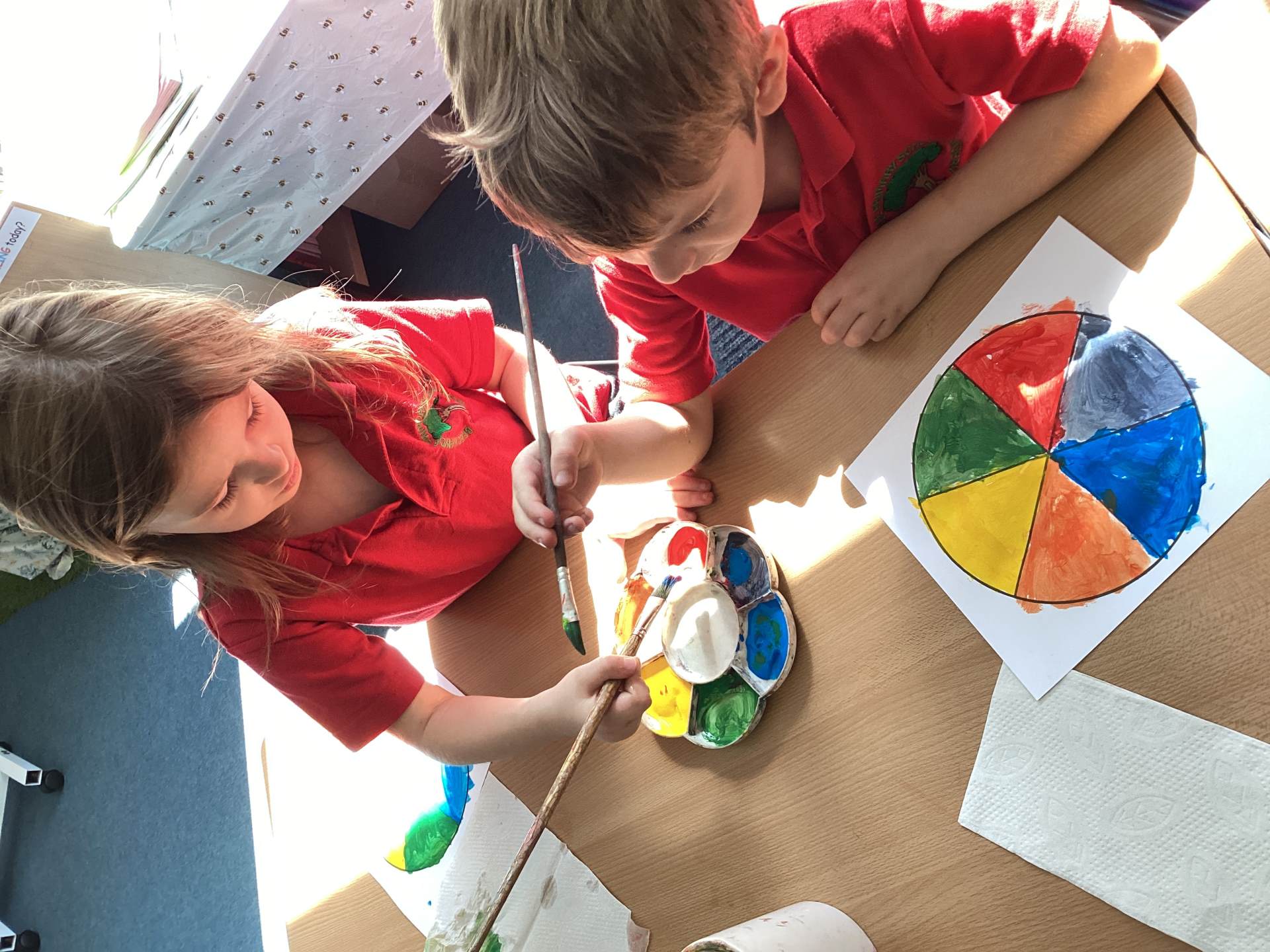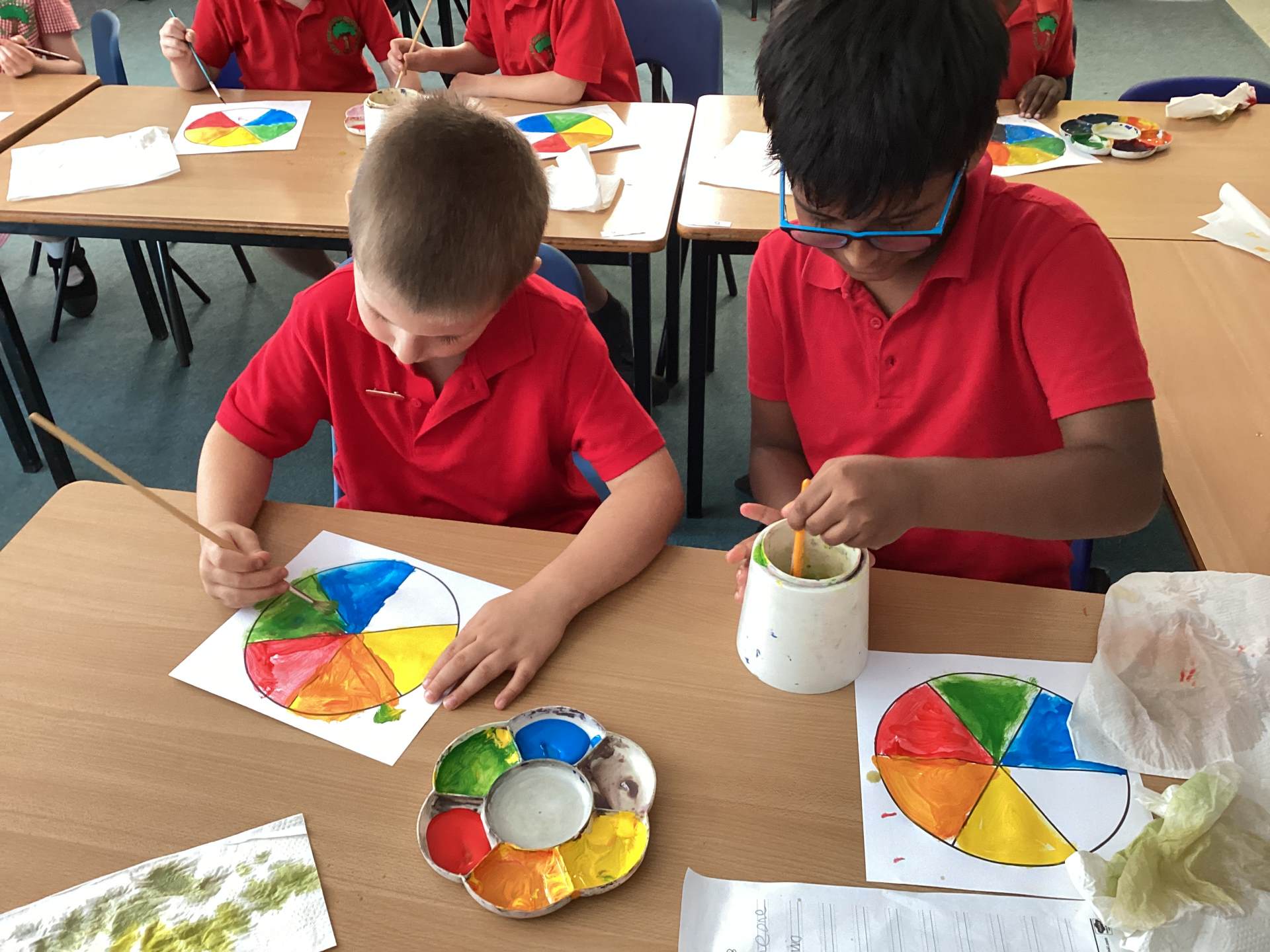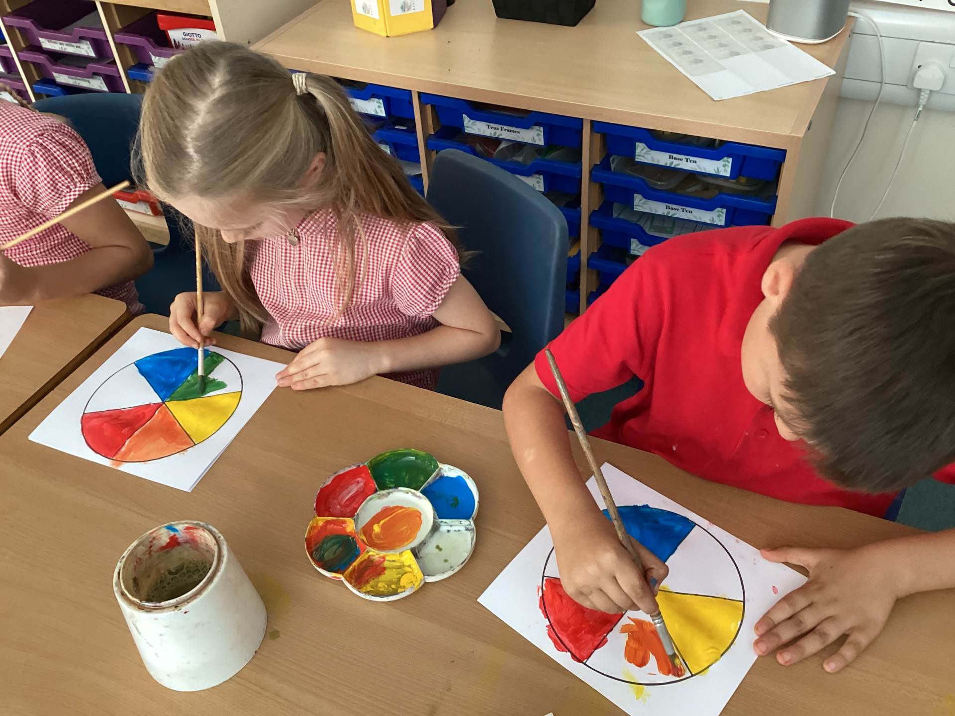 In Art, Year 2 have been exploring the work of Paul Klee, using drawing and painting to capture his unique style. They are developing their skills with colour, pattern, line, shape, form, and space. Their first step? Learning to mix primary colours to create a rainbow of secondary shades—a perfect start to their artistic journey!