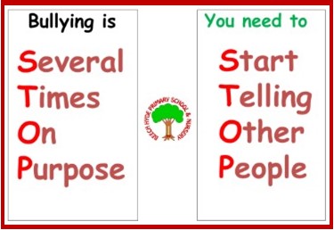 Pupils are encouraged to always tell an adult at school or home if someone is upsetting them. Each pupil has a network hand with the names of 5 trusted adults they can turn to if need be. There is a red STOP box in the hall, by the permanent anti-bullying display, so that pupils can write a message to staff if they need support. It is checked regularly.